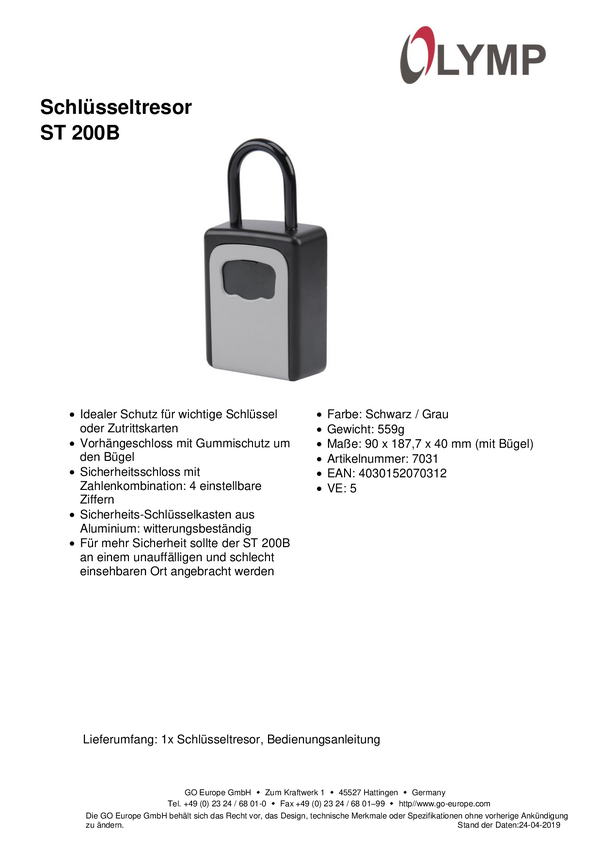 Sejf Olympia 7031, (S x W x G) 90 x 187.7 x 40 mm