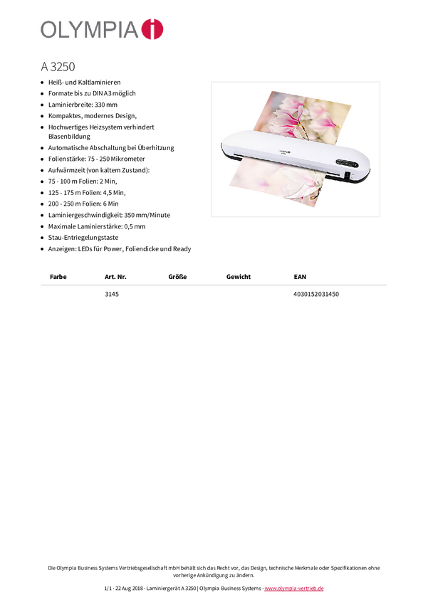 Olympia Laminator A 3250 3145 DIN A3, DIN A4, DIN A5, DIN A6, DIN A8