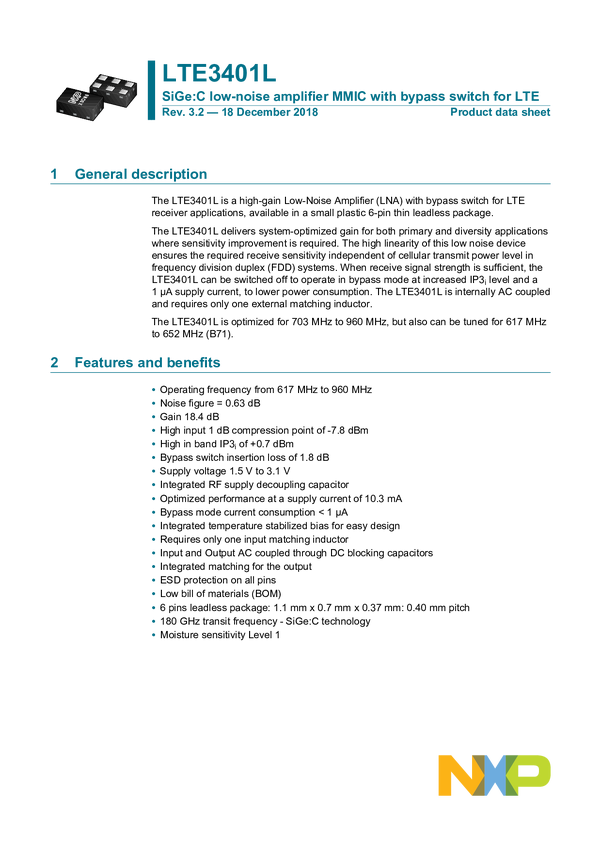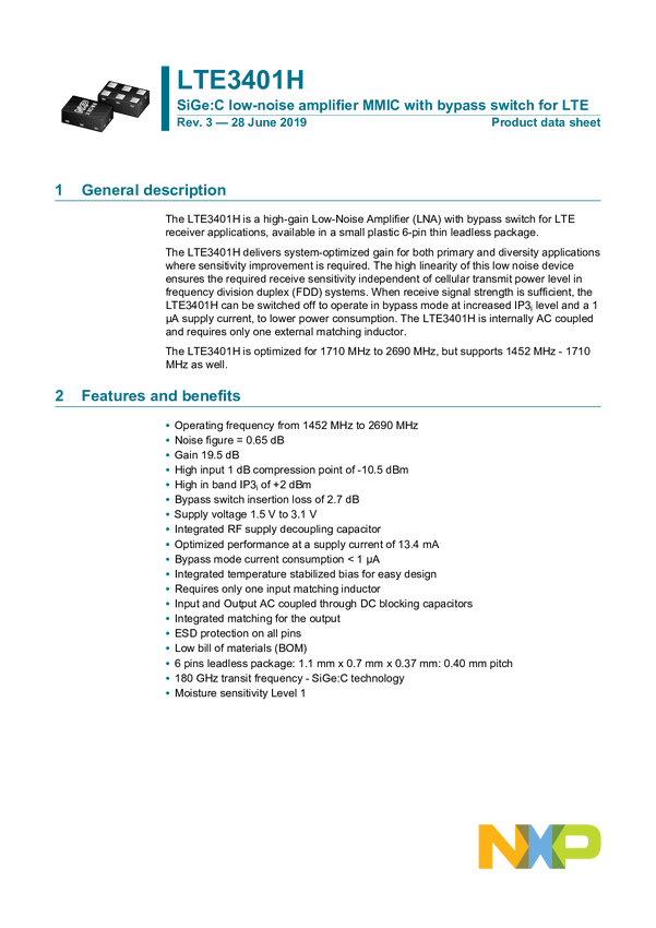 SiGe:C Low Noise Amplifier MMIC with Bypass Switch for LTE/5G NR