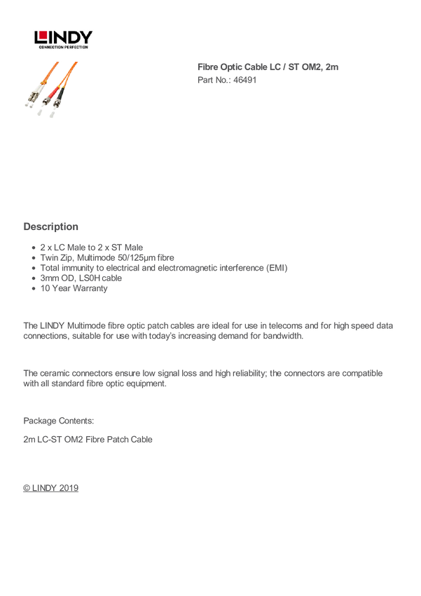 LINDY 46491 światłowodowe do światłowodów kabel 2.00 m Multimode OM2