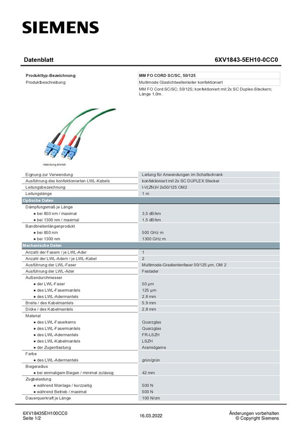 Siemens 6XV18435EH100CC0 światłowodowe do światłowodów kabel zielony 50/125 µ Multimode OM2
