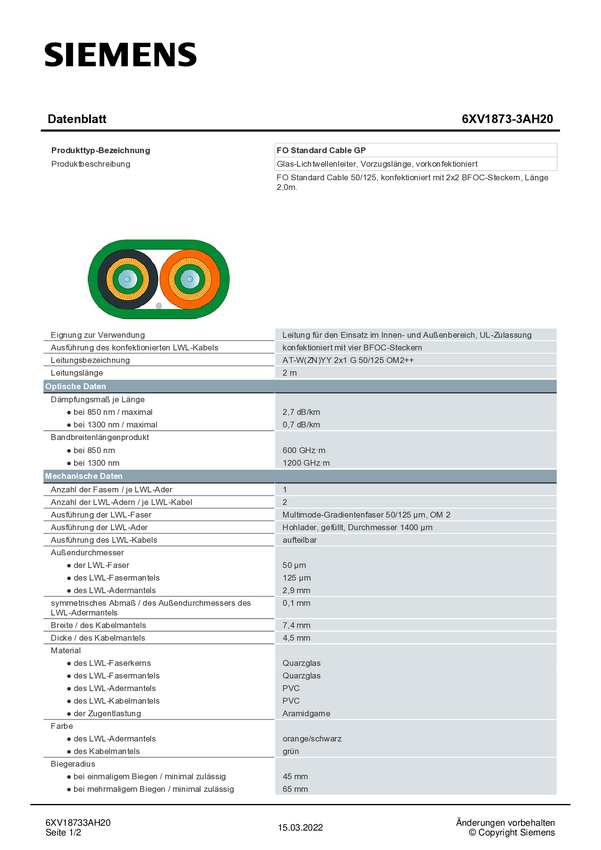 Siemens 6XV18733AH20 światłowodowe do światłowodów kabel zielony, pomarańczowy, czarny 50/125 µ Multimode OM2
