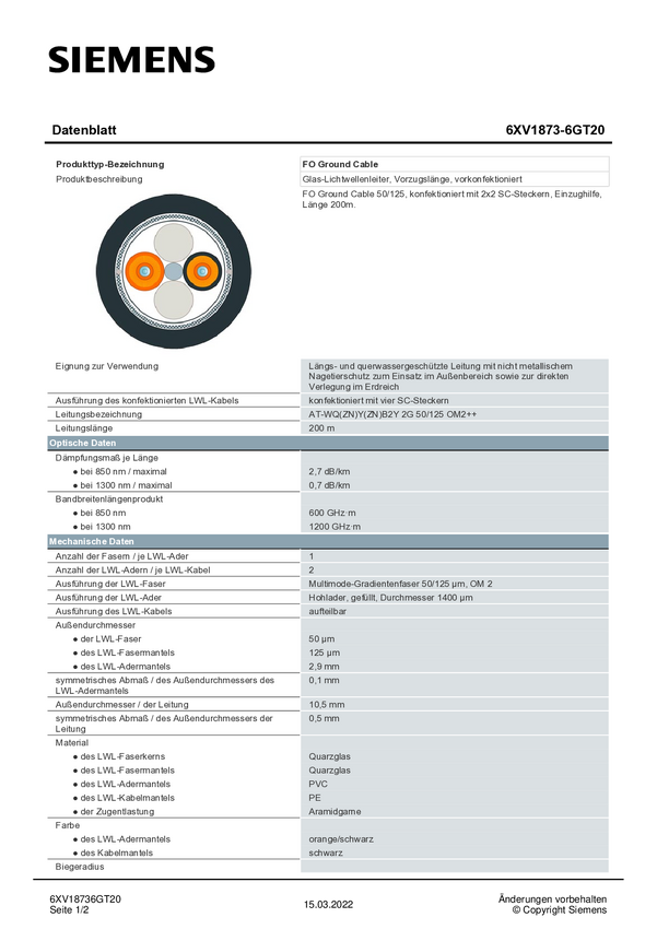 Siemens 6XV18736GT20 światłowodowe do światłowodów kabel czarny, pomarańczowy 50/125 µ Multimode OM2