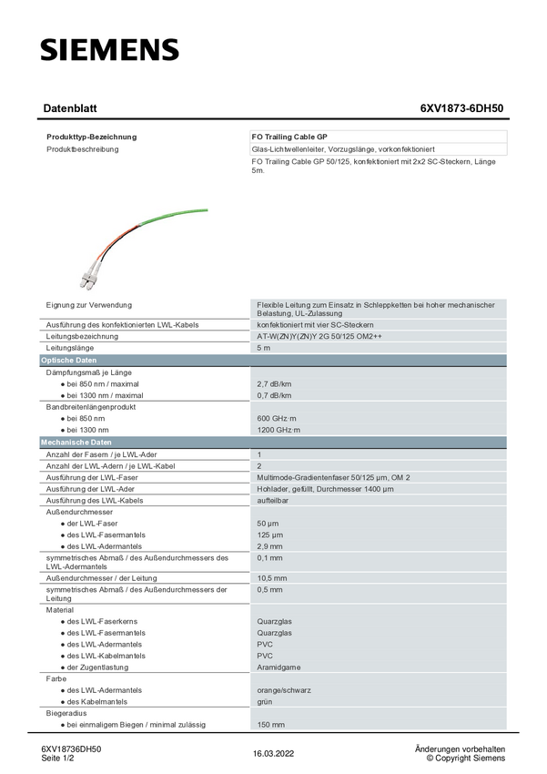 Siemens 6XV18736DH50 światłowodowe do światłowodów kabel zielony, pomarańczowy, czarny 50/125 µ Multimode OM2
