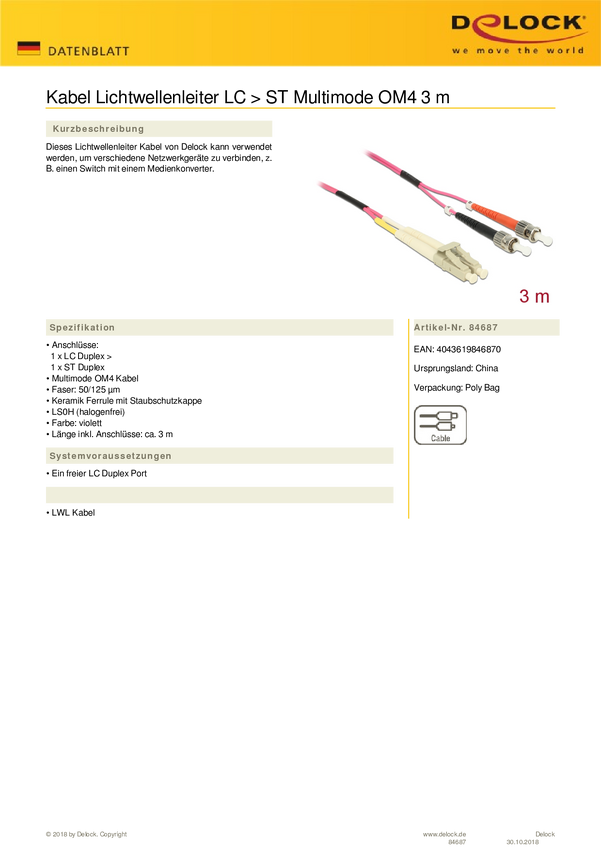 Kabel światłowodowy LC - ST wielomodowy OM4 3 m.