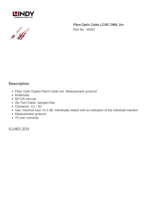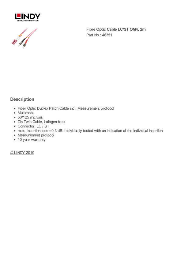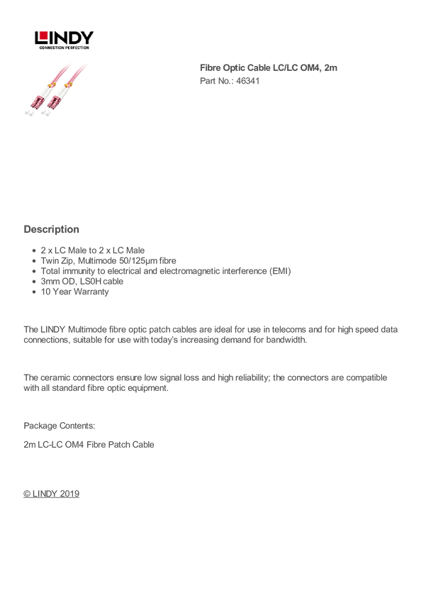 LINDY 46351 światłowodowe do światłowodów kabel 2.00 m Multimode OM4