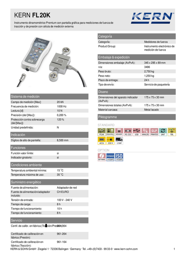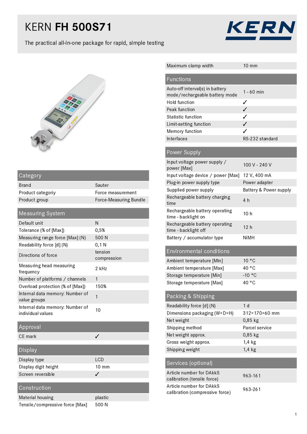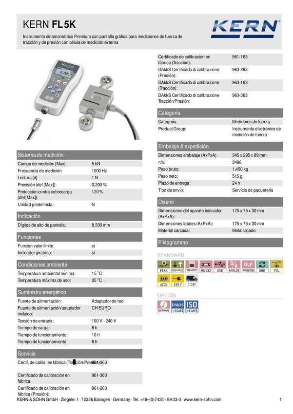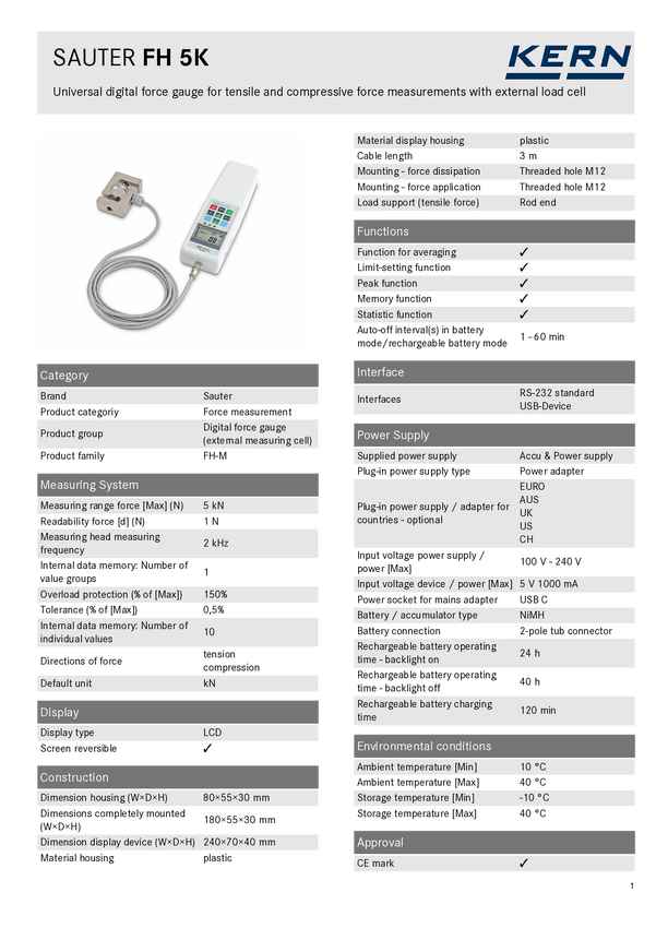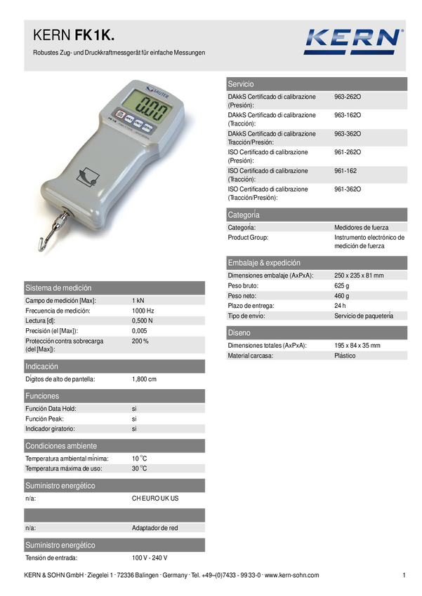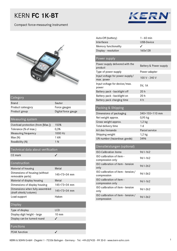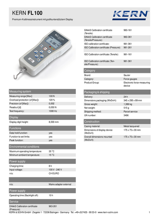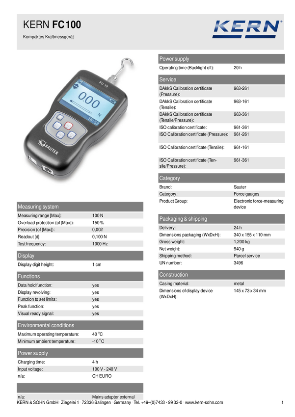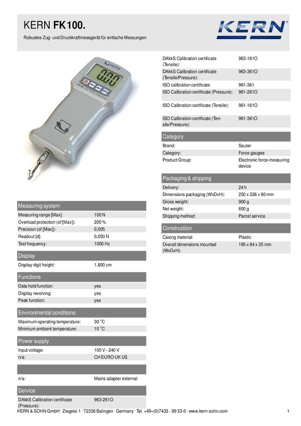 Siłomierz, niutonometr Sauter FK 1K. N/A Kalibracja (ISO)