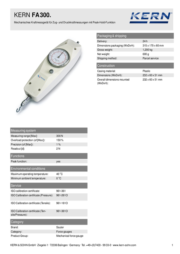 Siłomierz, niutonometr Sauter FA 300 N/A