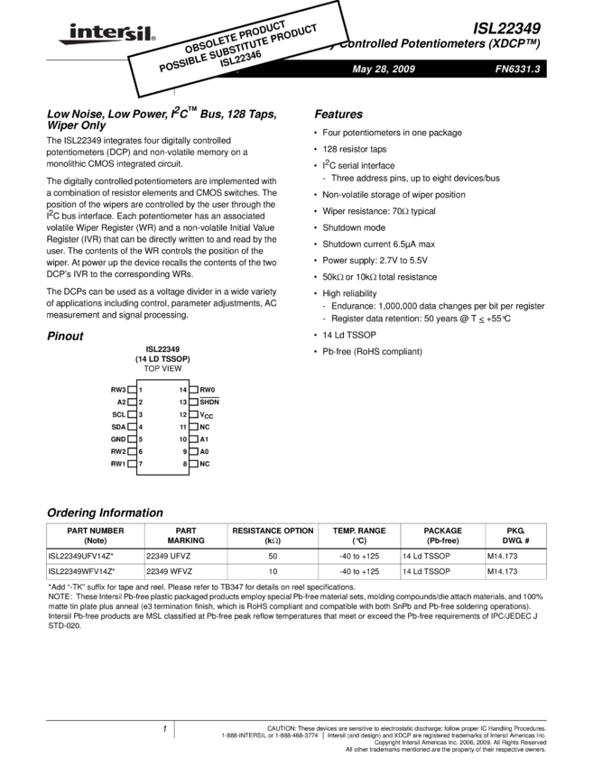 Quad Digitally Controlled Potentiometers (XDCP™); Low Noise, Low Power, IC® Bus, 128 Taps, Wiper Only
