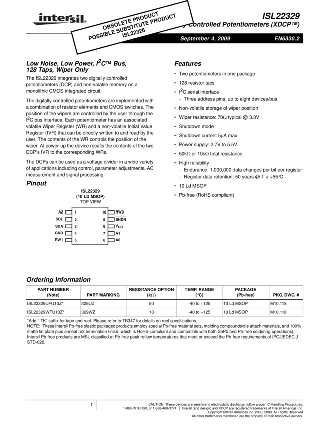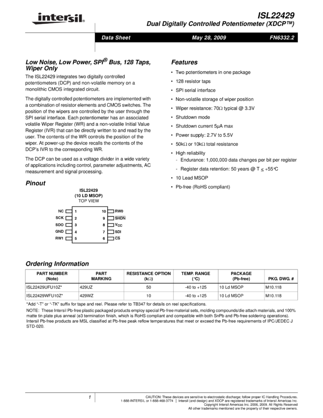 Dual Digitally Controlled Potentiometer (XDCP™); Low Noise, Low Power, SPI® Bus, 128 Taps, Wiper Only