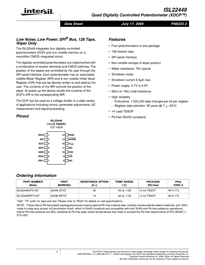 Quad Digitally Controlled Potentiometer (XDCP™); Low Noise, Low Power, SPI® Bus, 128 Taps, Wiper Only