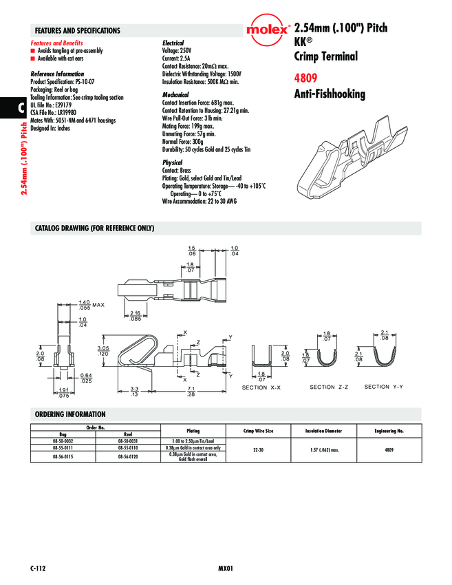 Pin metalowy; MX-4809C-P914; do złącza: MX-22-01-30.. (KK 254); 30-22AWG; 0,0509-0,3255mm2; 8500031; MOLEX; RoHS; opakowanie/100szt