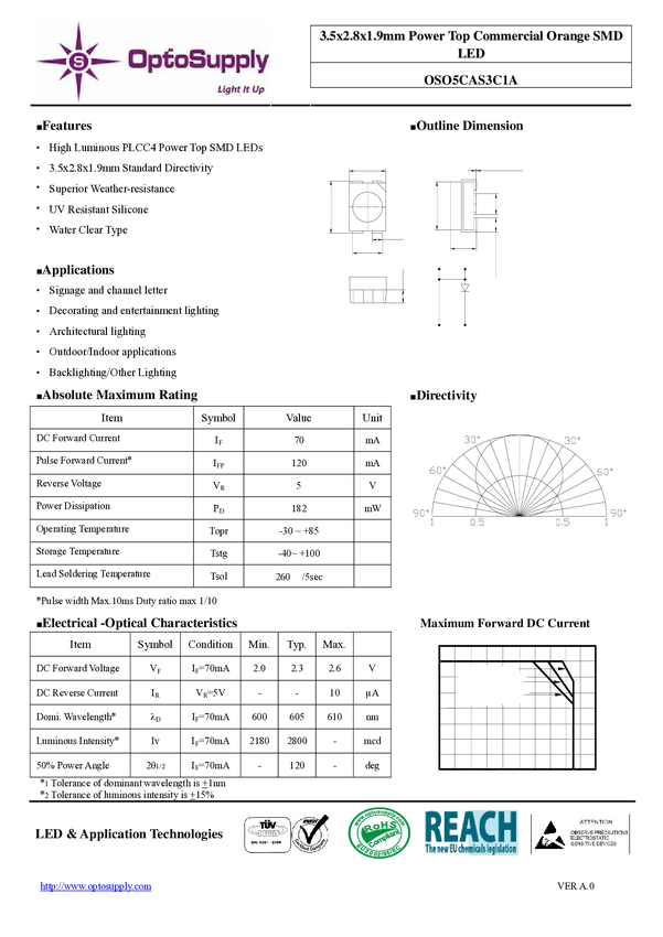 Dioda; LED; SMD; 3528; PLCC4; pomarańczowy; 2180-2800mcd; 3,5x2,8x1,9mm; 120*; 2-2,6V; 70mA; OPTOSUPPLY; OSO5CAS3C1A; RoHS; opakowanie/100szt