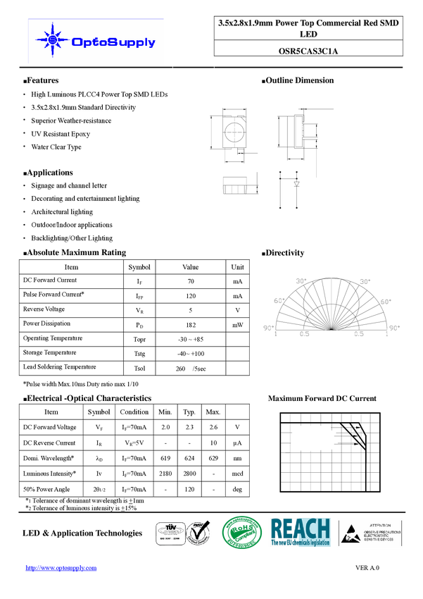 Dioda LED; OSR5CAS3C1A; 3528 (PLCC4); 3,5x2,8x1,9mm; SMD; czerwony; 120*; 2-2,6V; 70mA; RoHS; OPTOSUPPLY; RoHS; opakowanie/100szt