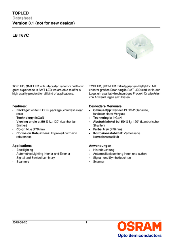 Dioda LED; LB T67C-Q2S1-35; SMD; 3528; PLCC2; niebieski; 20mA; 3-41V; 90-180mcd; 400-700mlm; 120*; 464-476nm; 3,4x3x2,1mm; OSRAM; opakowanie/100szt