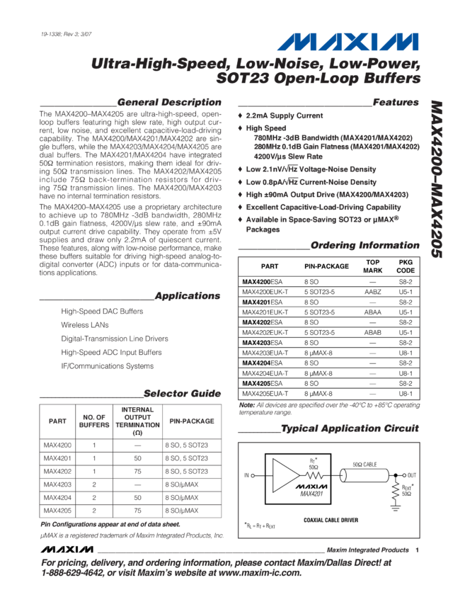 MAX4200, MAX4201, MAX4202, MAX4203, MAX4204, MAX4205 Ultra-High-Speed, Low-Noise, Low-Power, SOT23 Open-Loop Buffers