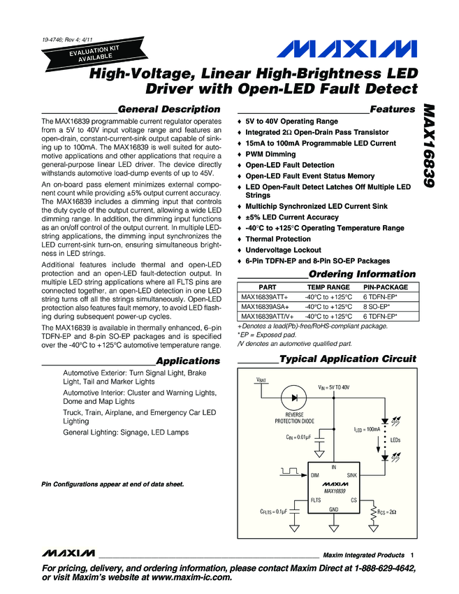 MAX16839 High-Voltage, Linear High-Brightness LED Driver with Open-LED Fault Detect