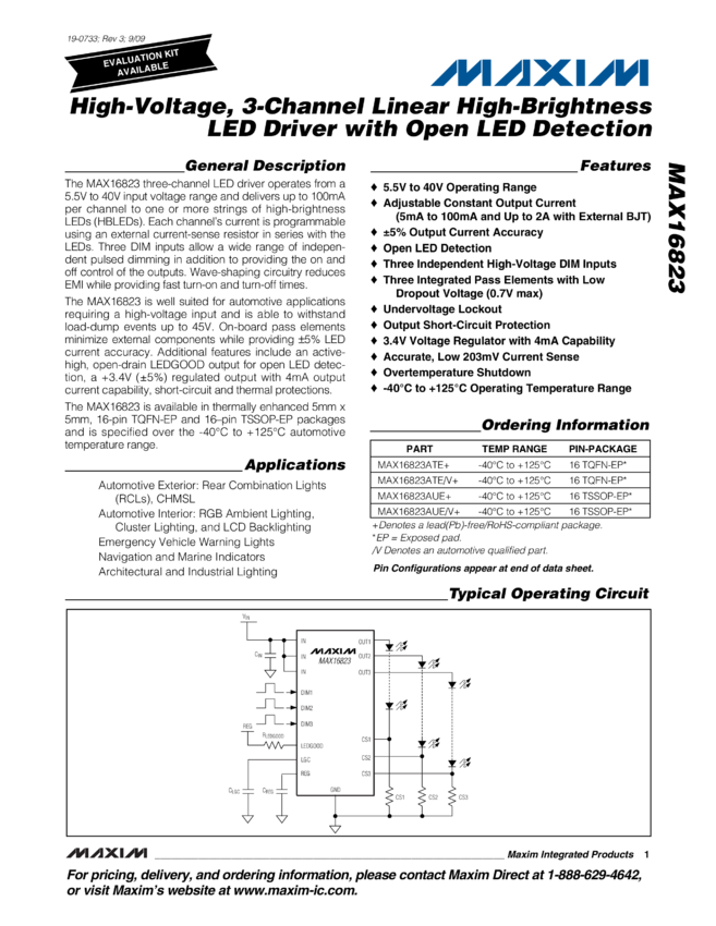 MAX16823 High-Voltage, 3-Channel Linear High-Brightness LED Driver with Open LED Detection