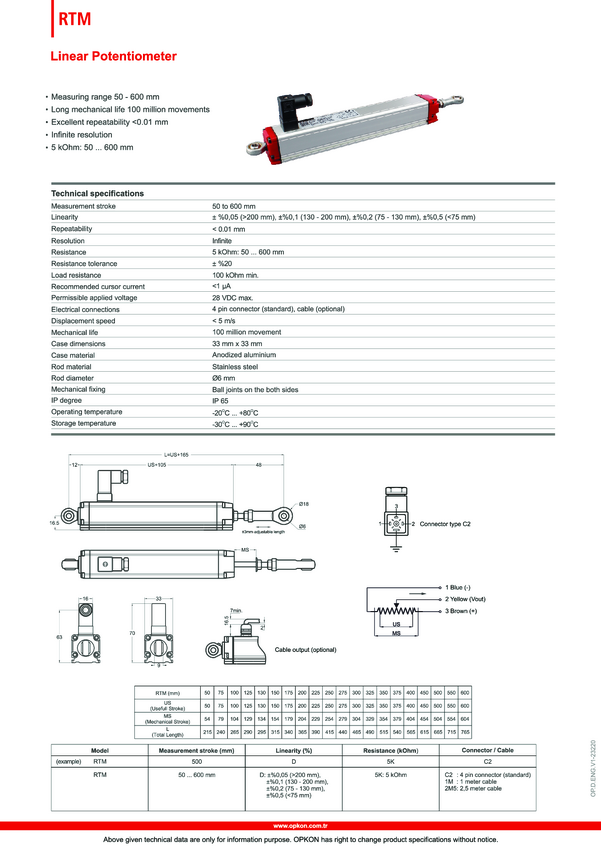 Transduktor Opkon RTM-600-D-5K-C2, 28 V/DC, Długość skoku 600 mm