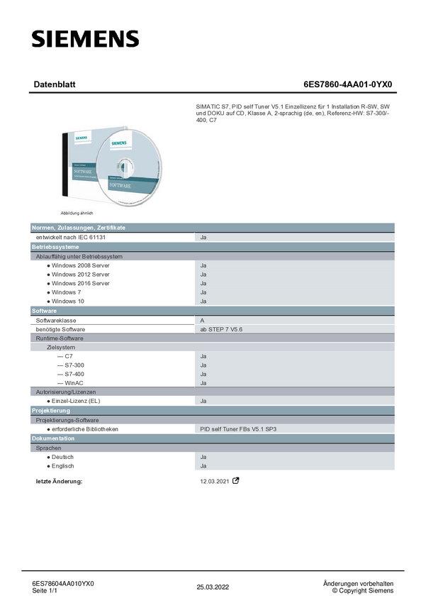 Oprogramowanie PLC Siemens 6ES7860-4AA01-0YX0 6ES78604AA010YX0, 1 szt.