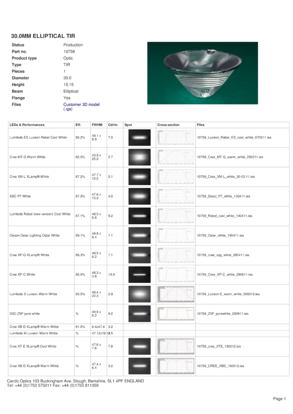 Soczewka Carclo 10759, eliptyczna, optyka typu TIR, do diod Cree serii: XP, MT-G, MT-G2, XM-L, XT-E, XB-D, śr:30mm, wys:15,15mm, FWHM(XP-E):48,1&deg x 6° FWHM(XP-G):48,5&deg x 8,2° FWHM(XP-C):48,3&deg x 3,8&deg