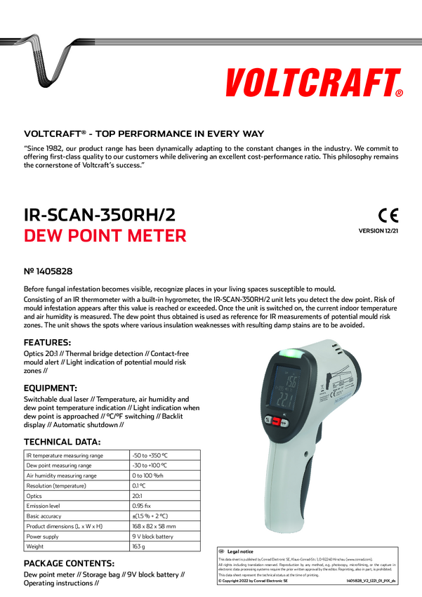 VOLTCRAFT IR-SCAN-350RH/2 Pirometr Kalibracja (DAkkS) Optyka 20:1 -50 - +380 °C Termometr bezdotykowy, Wykrywanie punktu