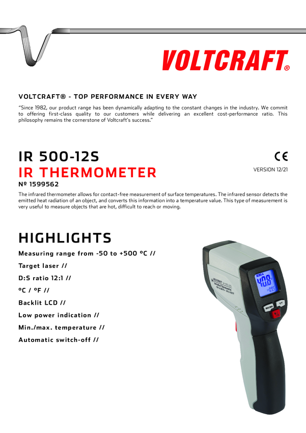 VOLTCRAFT IR 500-12S Pirometr Kalibracja (ISO) Optyka 12:1 -50 - 500 °C Termometr bezdotykowy