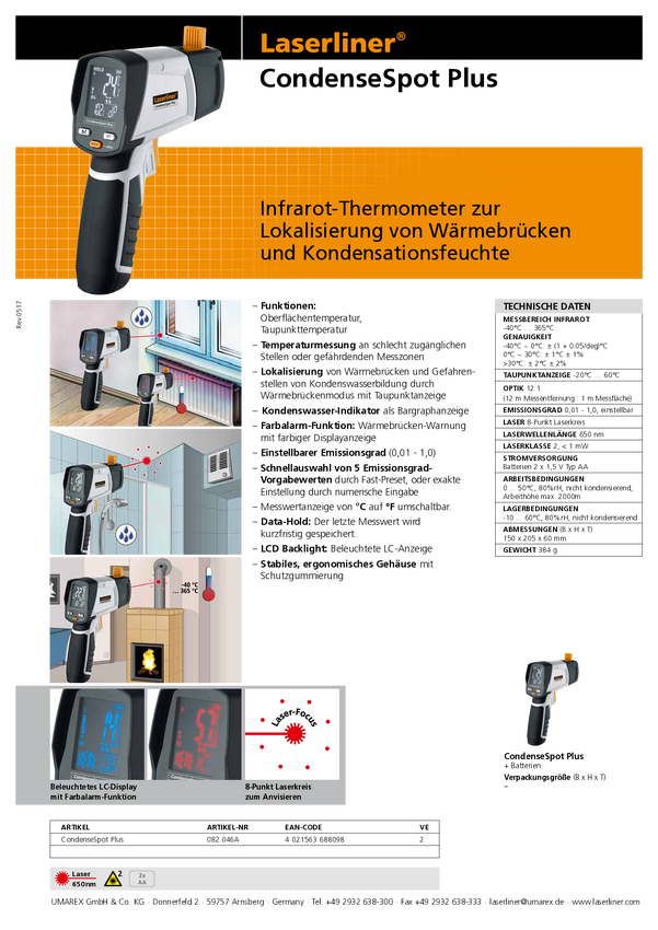Laserliner CondenseSpot Plus Pirometr Kalibracja (DAkkS) Optyka 12:1 -40 - 365 °C