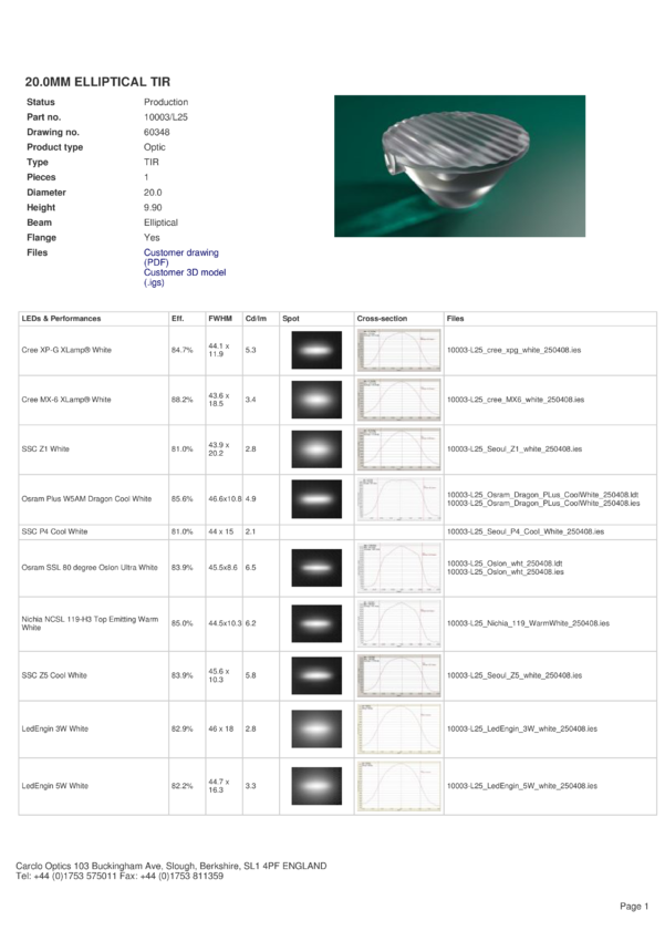 Soczewka Carclo 10003-L25, eliptyczna, optyka typu TIR, do diod Cree serii XP-G, XP-C, XT-E, XB-D, XM-L, MX6, śr: 20mm, wys:9,9mm, FWHM(XP-G):44,1&deg x 11,9° FWHM(XP-C):44,6&deg x 6,8&deg