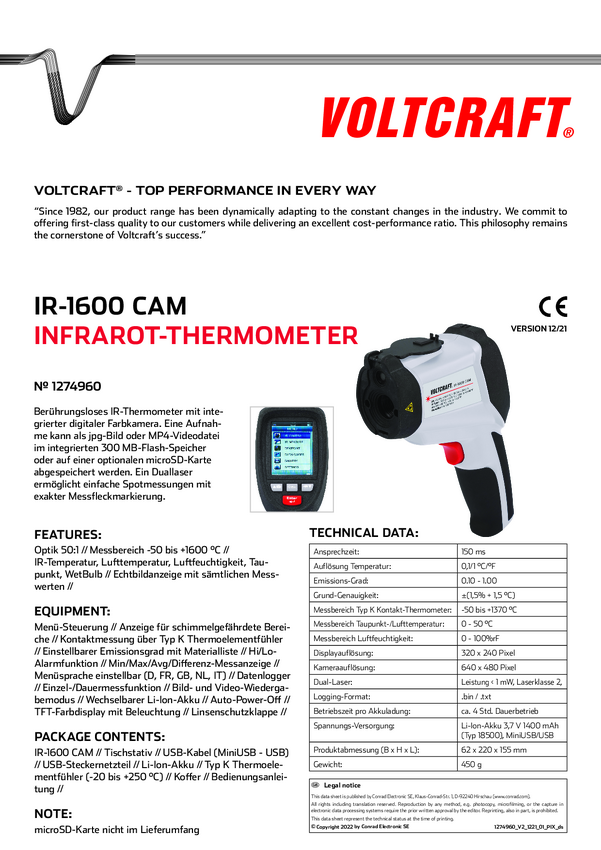VOLTCRAFT IR-1600 CAM Pirometr Optyka 50:1 -50 - +1600 °C Termometr bezdotykowy, Obraz rzeczywisty