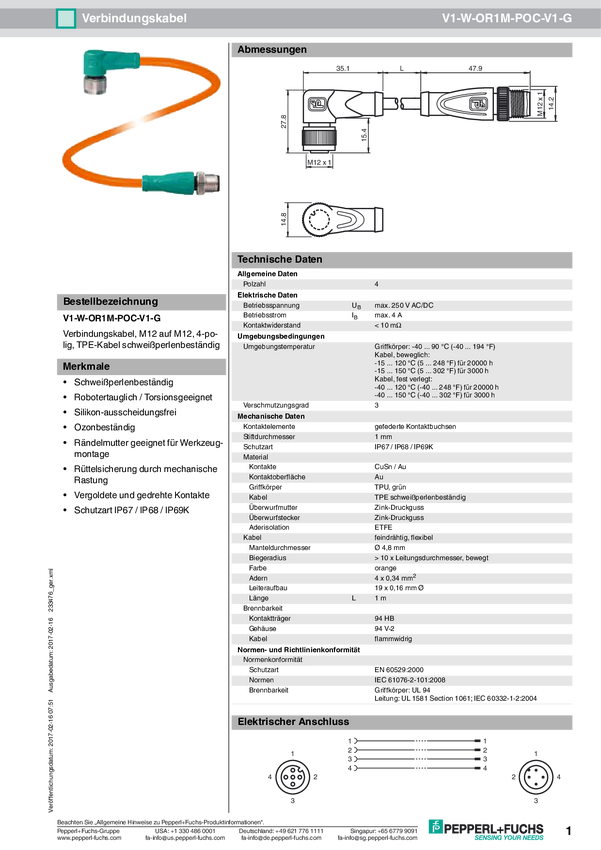 Pepperl+Fuchs 233476 Złącze czujnika/aktuatora V1-W-OR1M-POC-V1-G, piny: 4, 1.00 m, 1 szt.