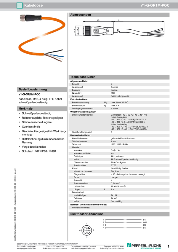 Gniazdo kablowe Pepperl+Fuchs V1-G-OR1M-POC 221855, piny: 4, 1.00 m, 1 szt.