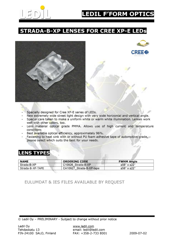 Soczewka STRADA-BXP, ±58&deg x ±22&deg, do diod LED High Power CREE seria XP-G, XP-E oraz XP-C, Ledil