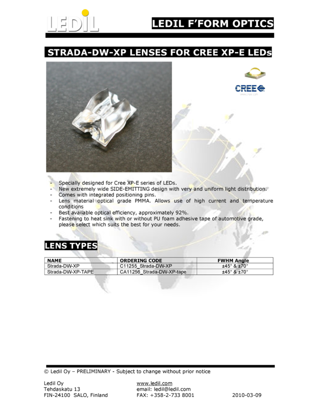 Soczewka STRADA-DW-11255, ±45&deg & ±70&deg do diod LED High Power CREE seria XP-E oraz XP-G, Ledil