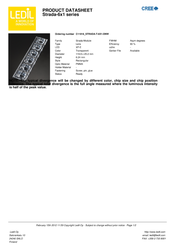 Soczewka STRADA-T-6X1-DNW-XP-11918, kąt astymetryczny, wymiary: 119.8 x 25.2 mm, wysokość 6.24 mm, do diod LED High Power CREE seria XP-G, XP-E oraz XP-C, Ledil/208
