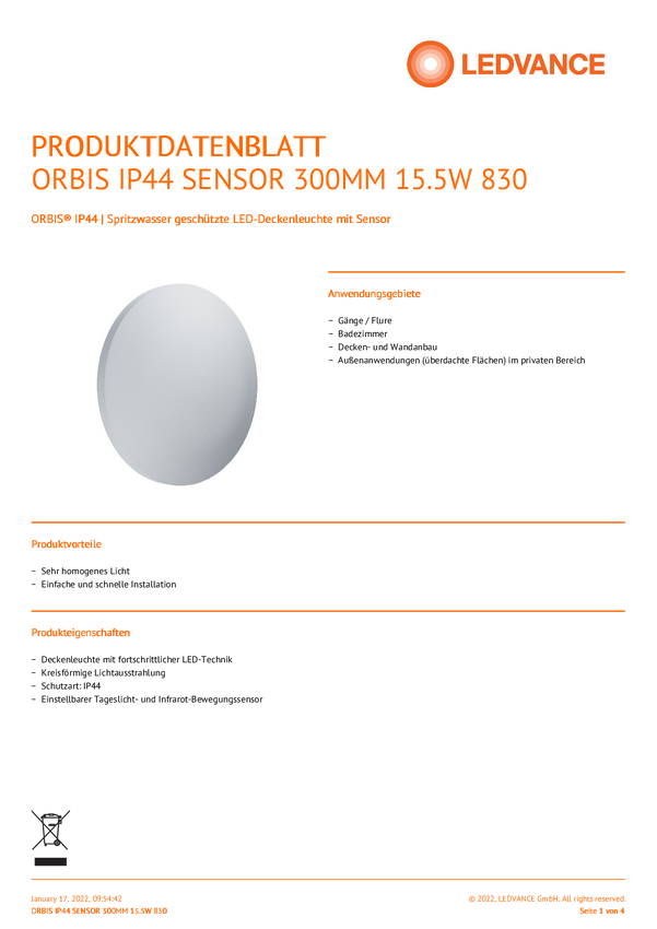 Lampa łazienkowa LED z czujnikiem ruchu LEDVANCE Orbis IP44 4058075651852 25 W 1800 lm