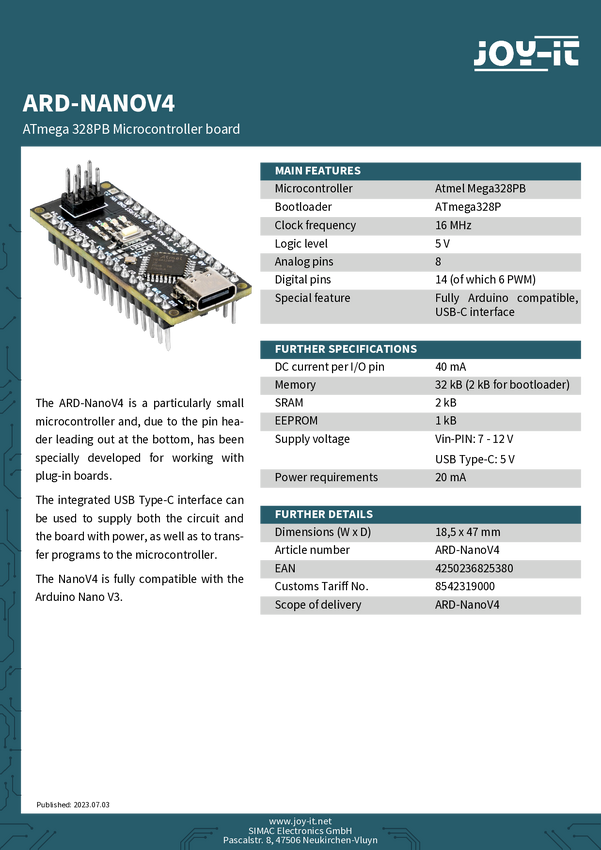 Joy-it ard-NanoV4 Płytka Arduino Nano V4 MC Arduino kompatibel (Original Chip)
