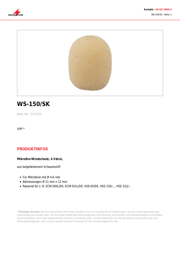 Osłonka przed wiatrem do mikrofonu Monacor WS-150/SK 1 szt.