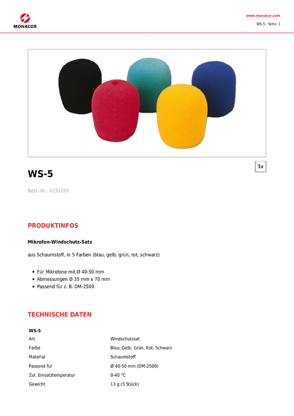 Osłonka przed wiatrem do mikrofonu Monacor WS-5 5 szt.