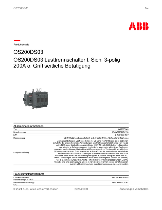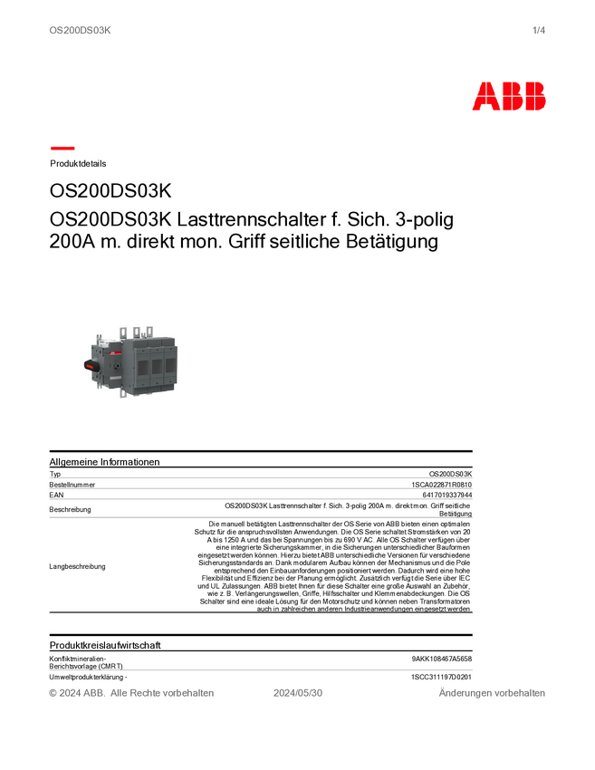 ABB OS200DZ03P Rozłącznik 200 A 1 szt.