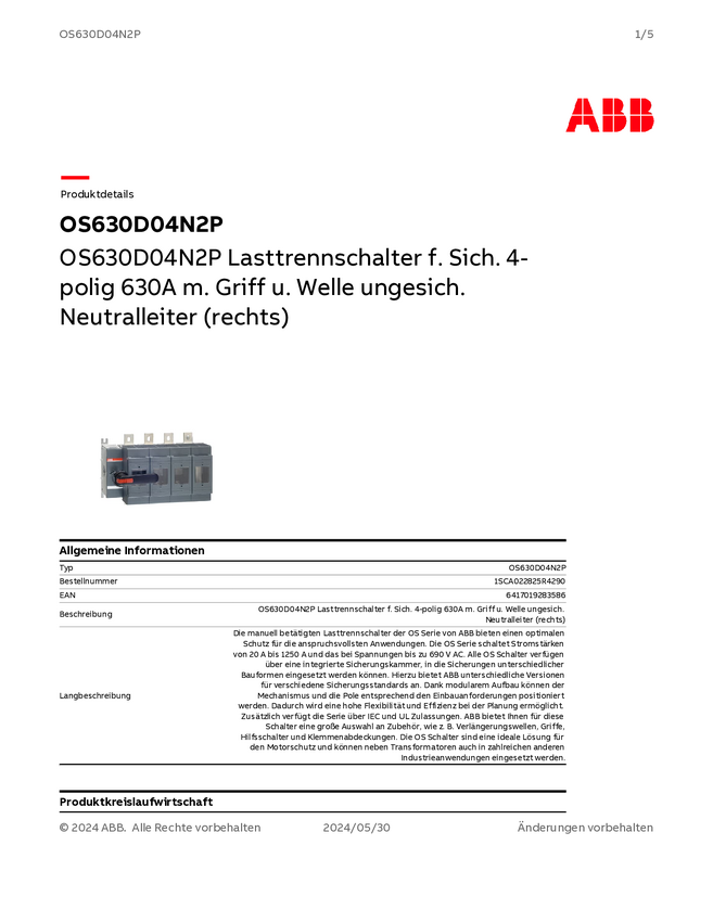 ABB OS630D04N2P Rozłącznik 570 A 1 szt.