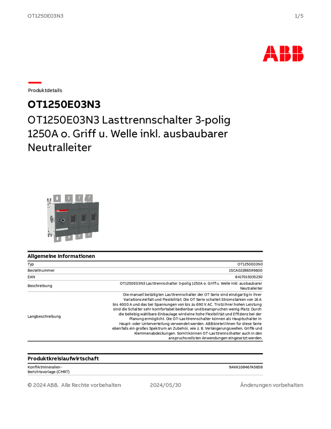 ABB OT1250E03N3 Rozłącznik 1250 A 1000 V 1 szt.