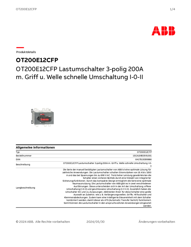 ABB OT200E04WCLP Przełącznik zmiany kierunku 200 A 1000 V czarny 1 szt.