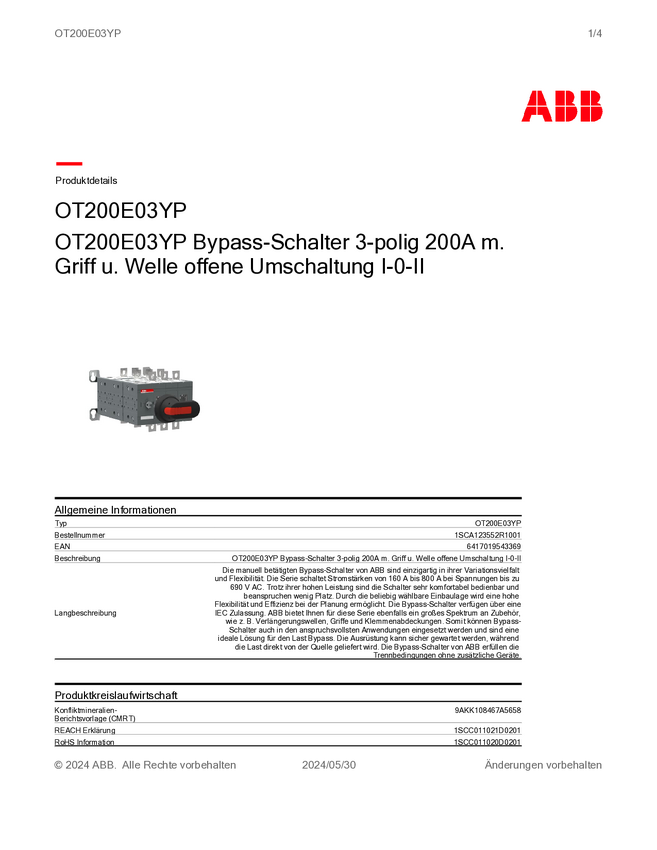 ABB 1SCA123552R1001 Przełącznik obejściowy OT200E03YP, 1000 V, 250 A