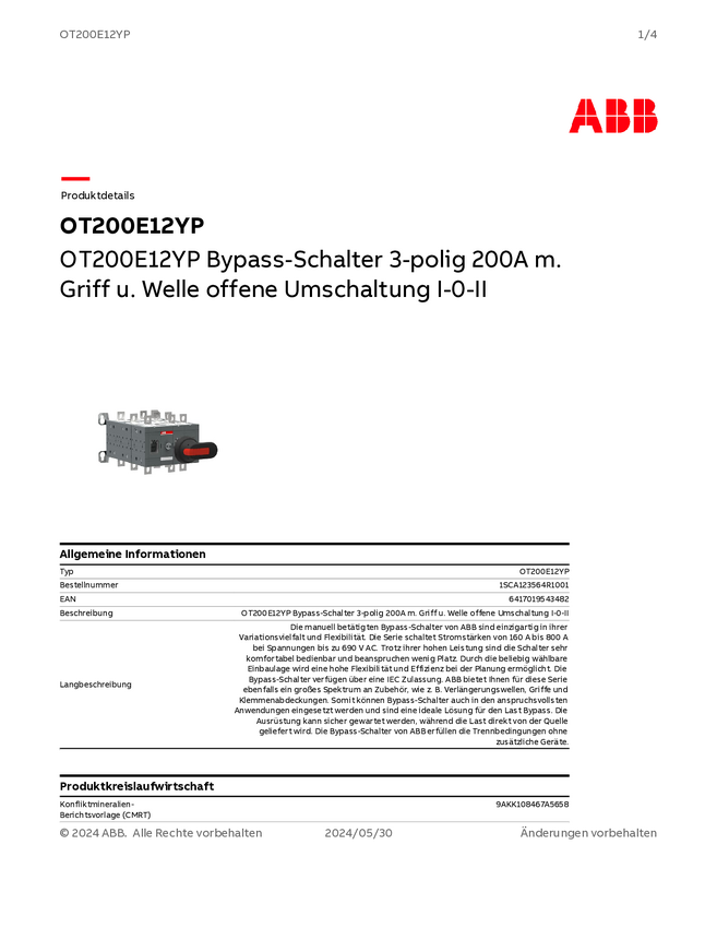ABB 1SCA123564R1001 Przełącznik obejściowy OT200E12YP, 1000 V, 200 A