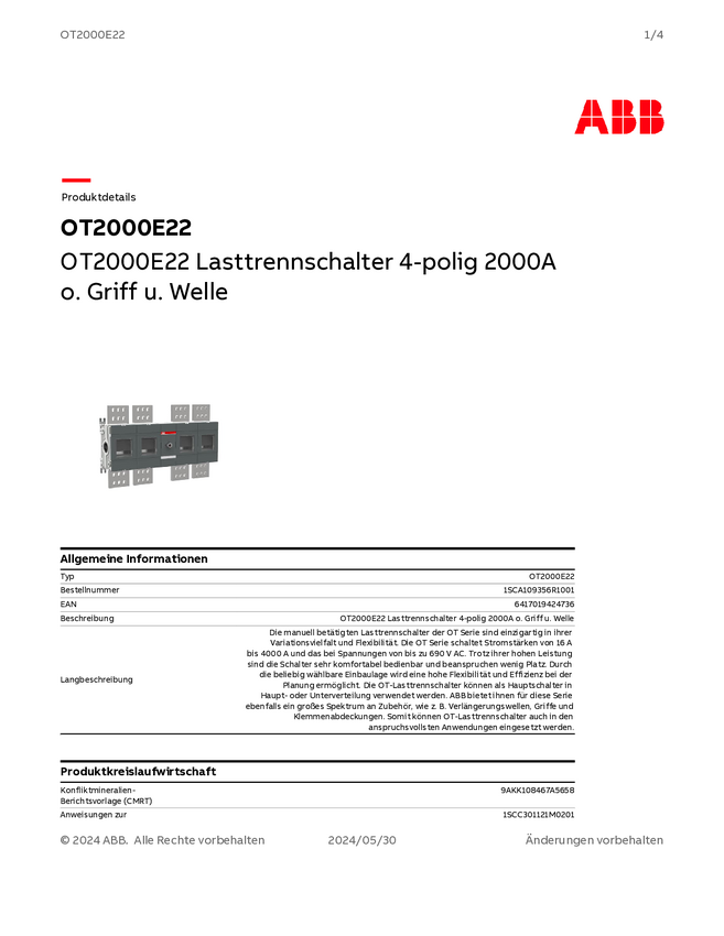 ABB 1SCA118458R1001 Rozłącznik OT2000EP04P, 1000 V