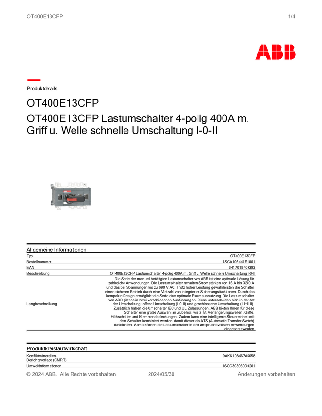 ABB 1SCA106441R1001 Przełącznik zmiany kierunku OT400E13CFP, 1000 V, 400 A