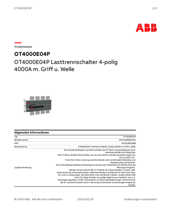ABB 1SCA124856R1001 Rozłącznik OT4000E04P, 1000 V
