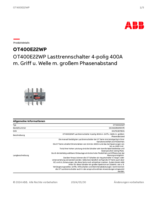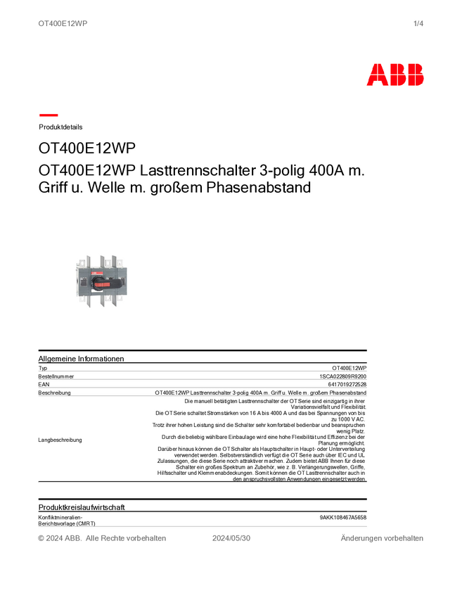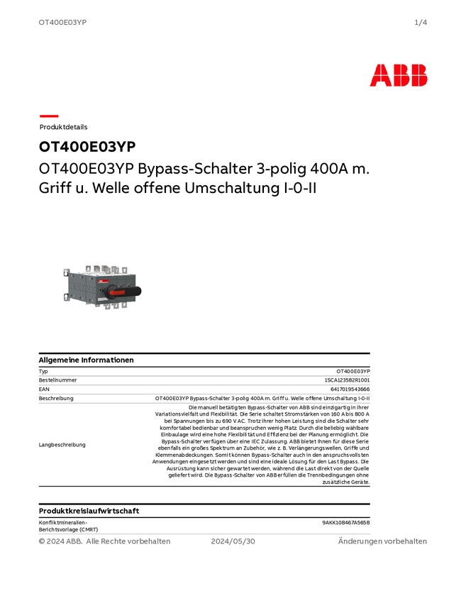 ABB 1SCA124026R1001 Przełącznik obejściowy OT400E04YP, 1000 V, 400 A
