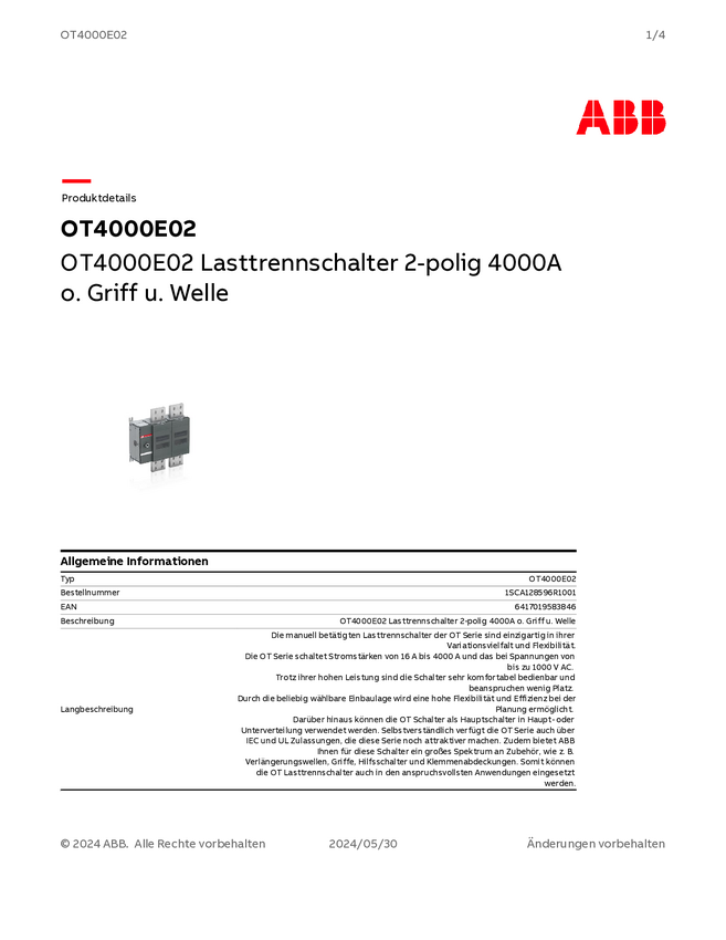 ABB 1SCA128596R1001 Rozłącznik OT4000E02, 1000 V